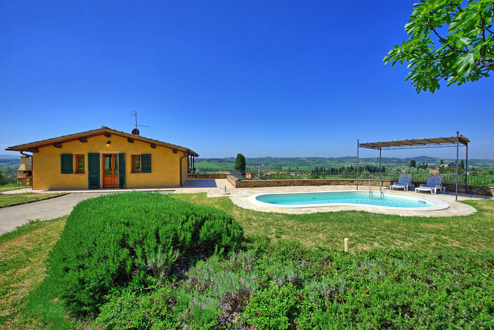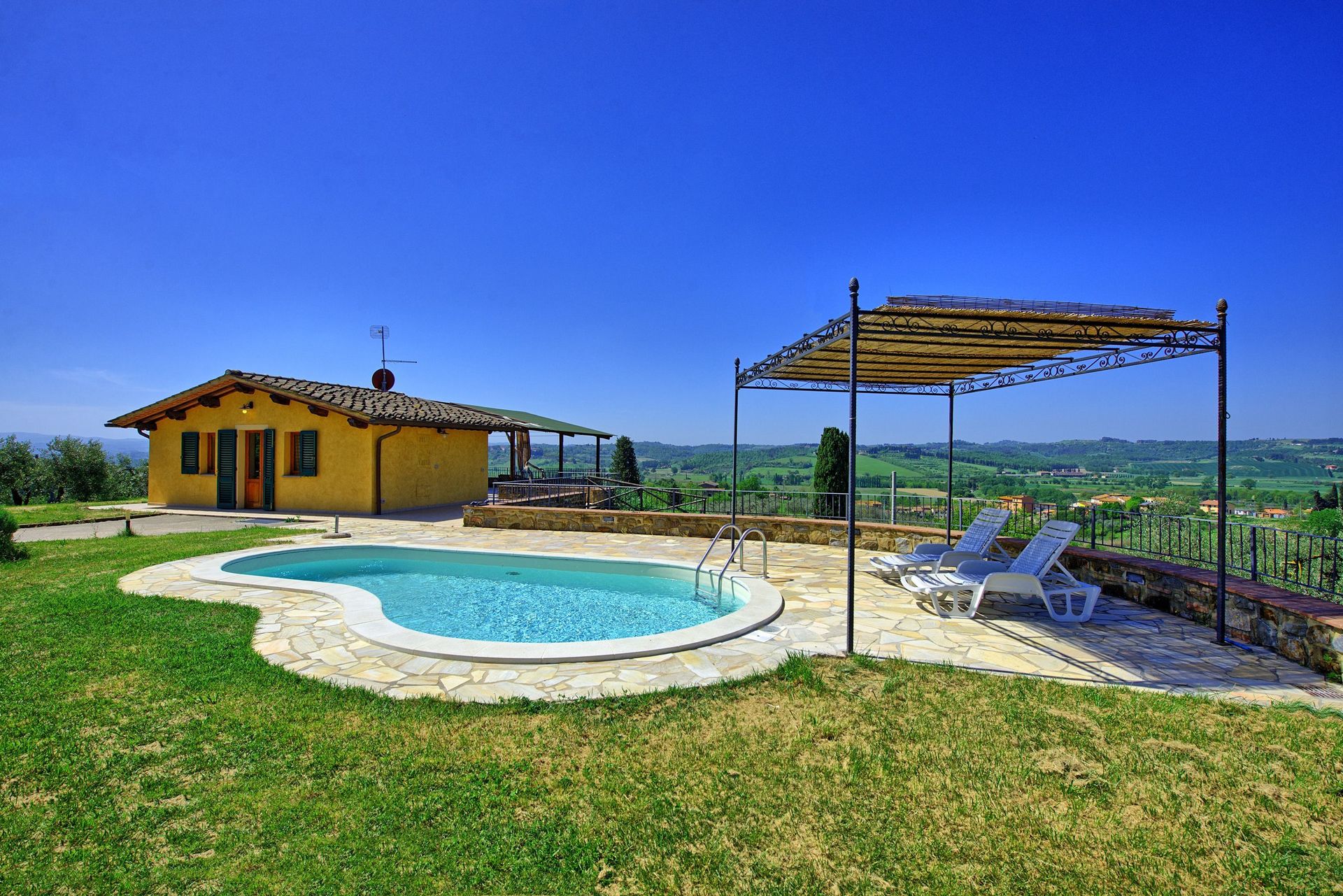 Lille hus med privat pool på bakkerne omkring den lille by Cambiano i Toscana. Feriehuset blev bygget i 2009 og ligger 45 km fra Firenze. Ejendommen byder på skønne udendørs arealer med en smuk terrasse, havepavillon, møbleret have og privat pool. Interiøret er indbydende og huset har aircondition. Fra ejendommen har man smuk panoramaudsigt.