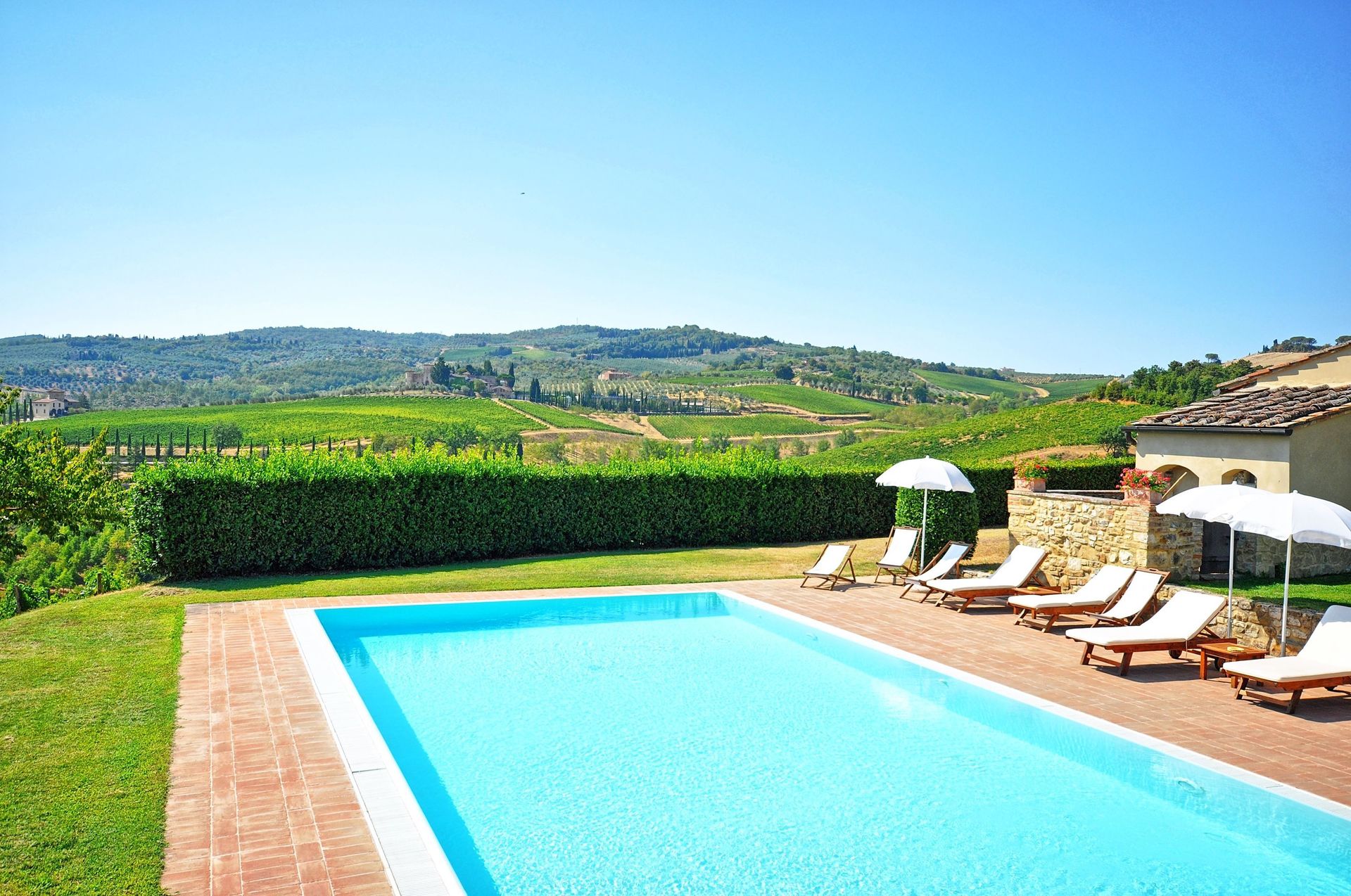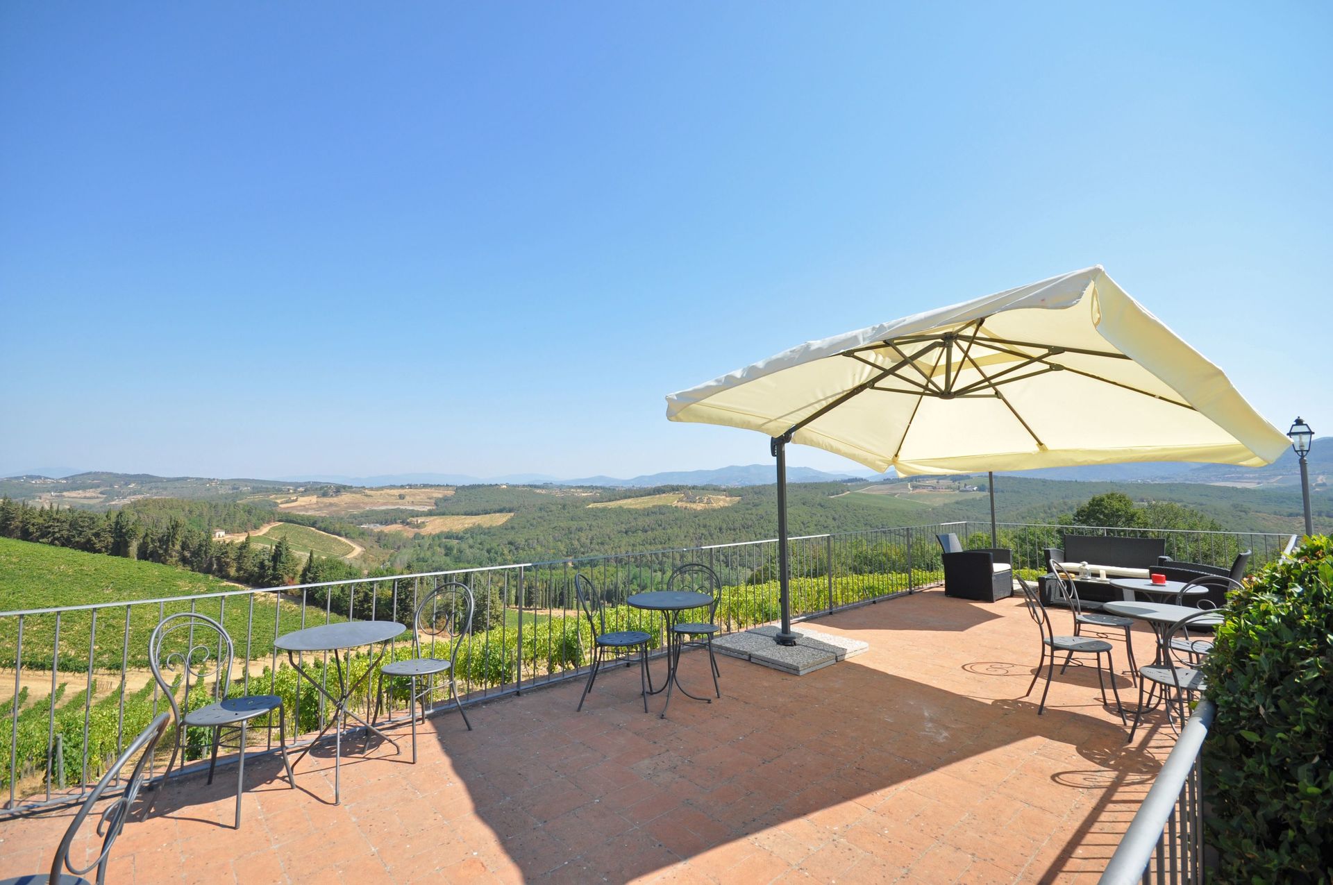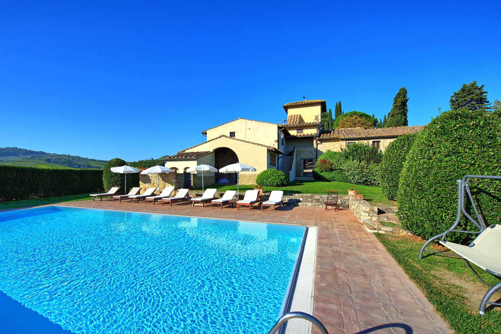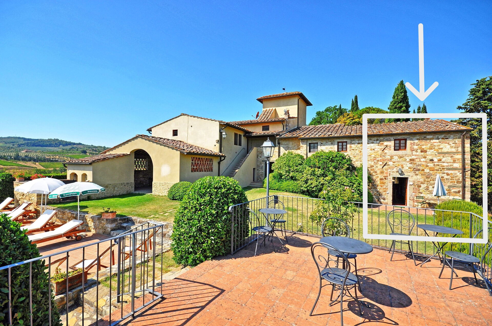 Beautiful farming estate comprising 6 restored units situated on the Chianti hills, a short distance from the village of Mercatale (with general stores) and 22 km from Florence away. This property offers large outdoor areas and a nice panoramic pool with splendid views over the surrounding vineyards (producing excellent wines). All of the apartments provide welcoming interiors furnished in a rustic style. The units Tenuta 1 and 2 are approx. 50 from the pool away while the remaining units are closer. By the pool, guests can enjoy use of a beautiful panoramic terrace with sun-umbrellas and sofas and of a covered area with WI-FI in internet connection (WI-FI internet is also available near the reception, closer the units Tenuta 1 and 2).