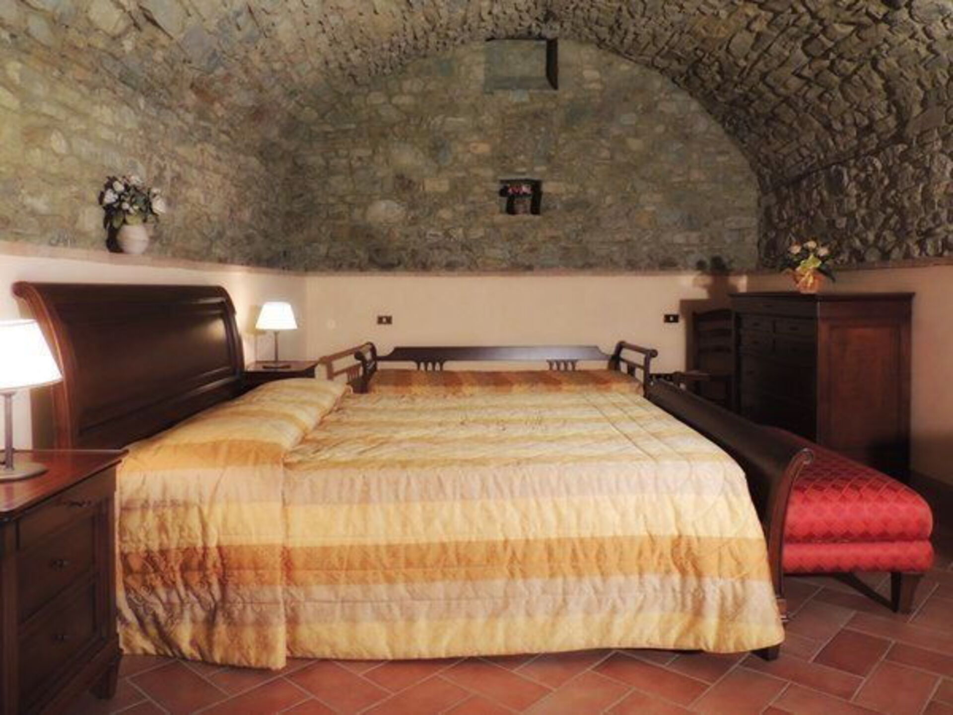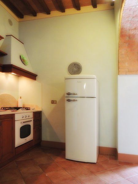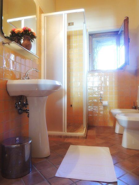 Apartment Ginestra 92 m². 4 persons. Situated on the ground floor of a old stone house detached from the U-shaped central building of the resort, has got typical tuscan furnishings. Independent access from the large living/dining room with satellite tv, double sofa-bed and 1 extra single bed (bookable at an extra price), exit to external area, connected to full equipped kitchen (4 hotplates, oven, dishwasher, fridge), two bedrooms (one with a double bed and exit to external area, one with two twin beds), one bathroom with wc, bidet and shower. Roofed private terrace with table and chairs. Independent heating.