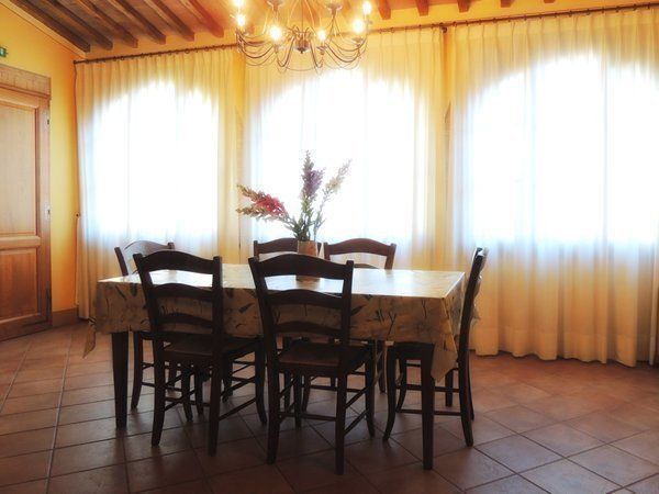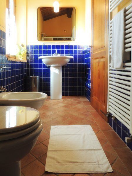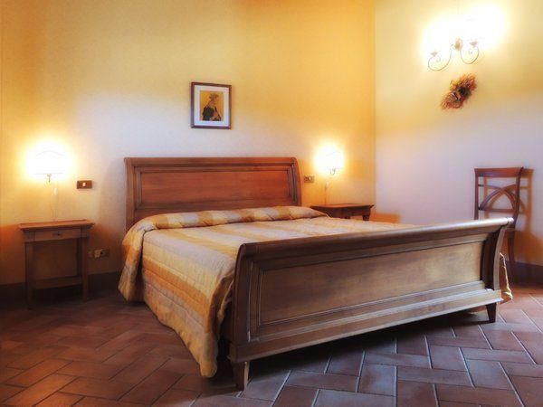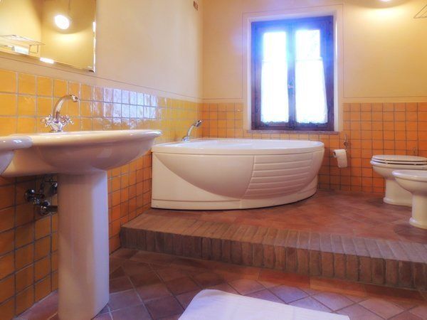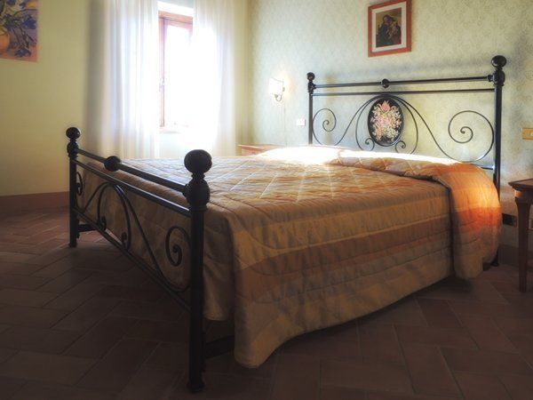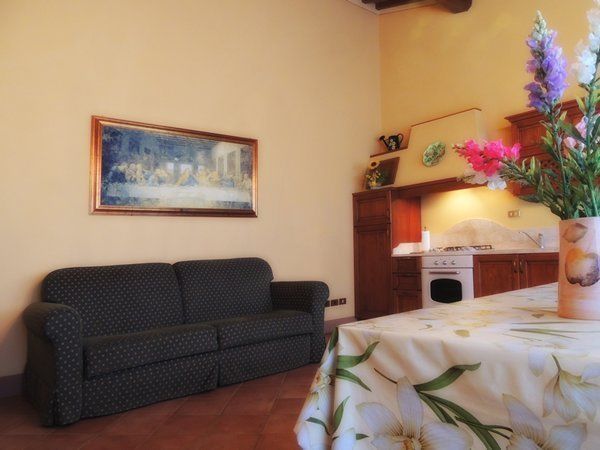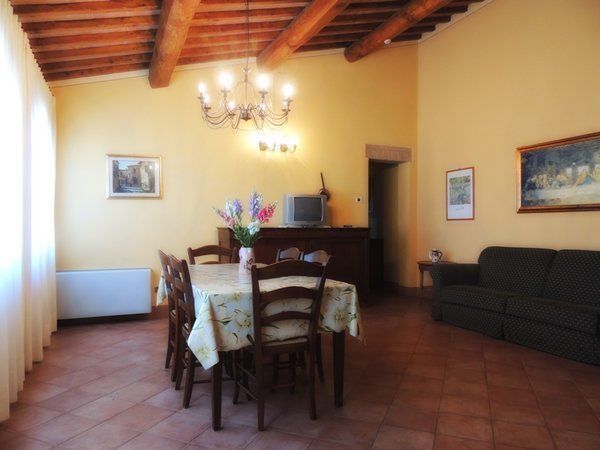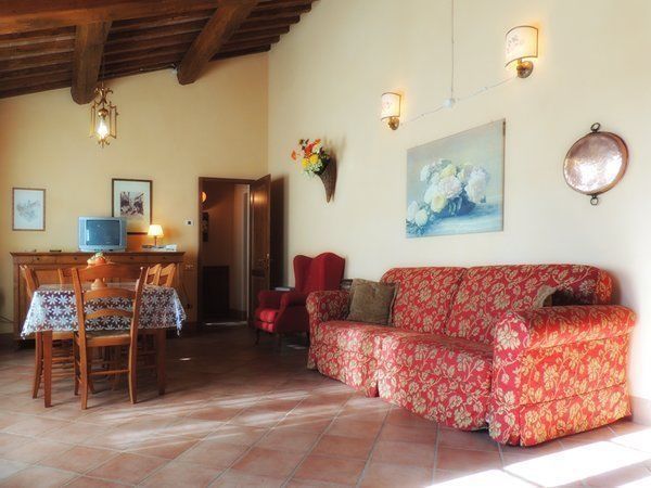 Apartment Margherita 105 m². 6 persons. Situated on the first floor in the central part of the court yard (Piazza) of the resort, access via indoor stairs shared with another apartment. Has got typical tuscan furnishings, one large living/dining room with satellite tv and double sofa-bed (bookable at an extra price), with full equipped kitchen (4 hotplates, oven, dishwasher, fridge), three bedrooms (two with a double bed, one with two twin beds), 1 bathroom with bidet, shower, wc and direct access from one of the double rooms, 1 bathroom with bidet, wc, shower and bath tub. Outdoor reserved table and chairs in the courtyard. Independent heating.