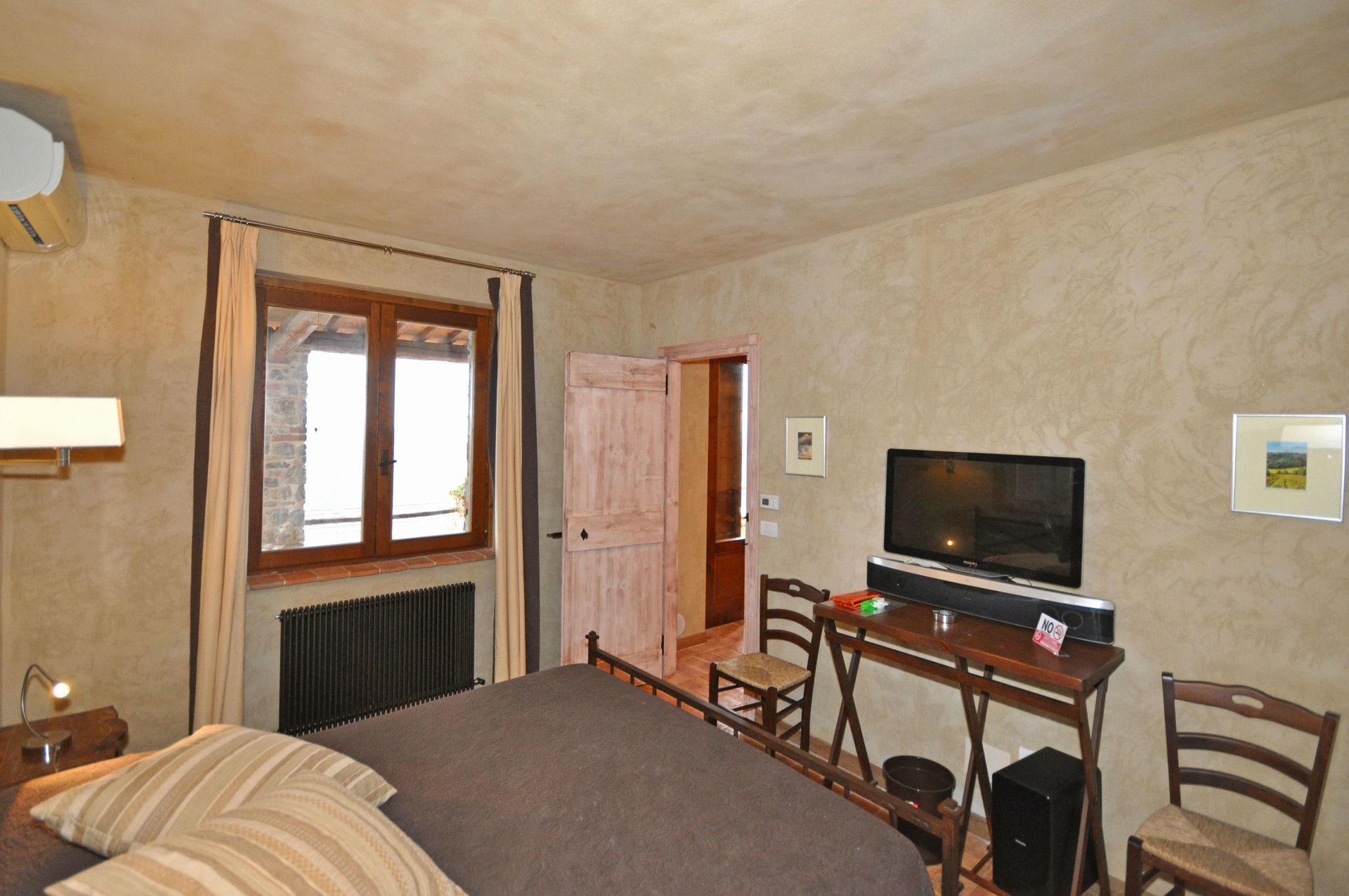 Ground floor: small living room with single sofa bed, dining area and kitchen corner, double bedroom (LED satellite TV, hi-fi and blu-ray), bathroom with shower.