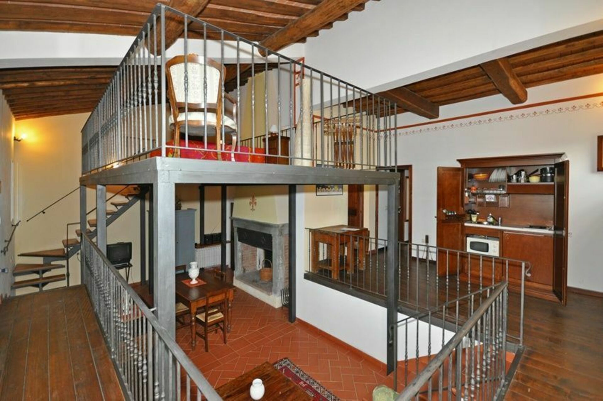 Ground floor: kitchen corner (2 electric hot plates, microwave), bathroom with shower.