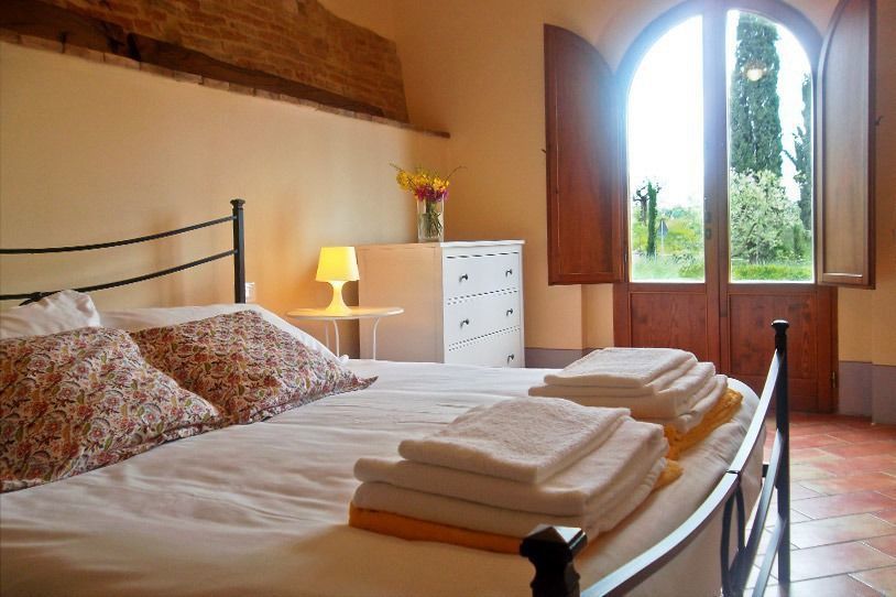 Two large bedrooms with ensuite bathrooms and air conditioning. The largest suite has a corner bathtub and also a walk-in tiled shower and windows with spectacular views of Montepulciano.