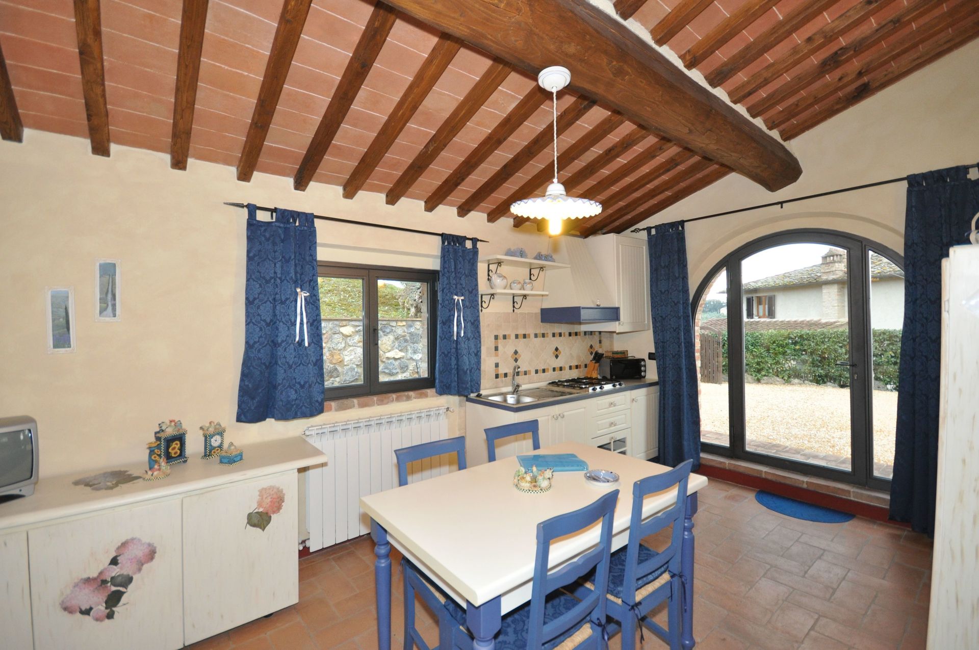 Wir haben eine wunderschöne Woche in der Ferienwohnung Ortensia verbracht. Die Wohnung ist sehr sauber und sehr schön eingerichtet. Es ist so gemacht wie man sich den toskanischen Stil vorstellt. Teracottafarbene Fliesen im Bad. Holz an der Decke und Blumenbilder an den Wänden. Die Terrasse und der Garten sind traumhaft und was in der Beschreibung gar nicht erwähnt wird, ist der Ausblick auf San Gimignano. Der ist sensationell. Sonnenuntergang mit Blick auf die Türme. Sooo schön.