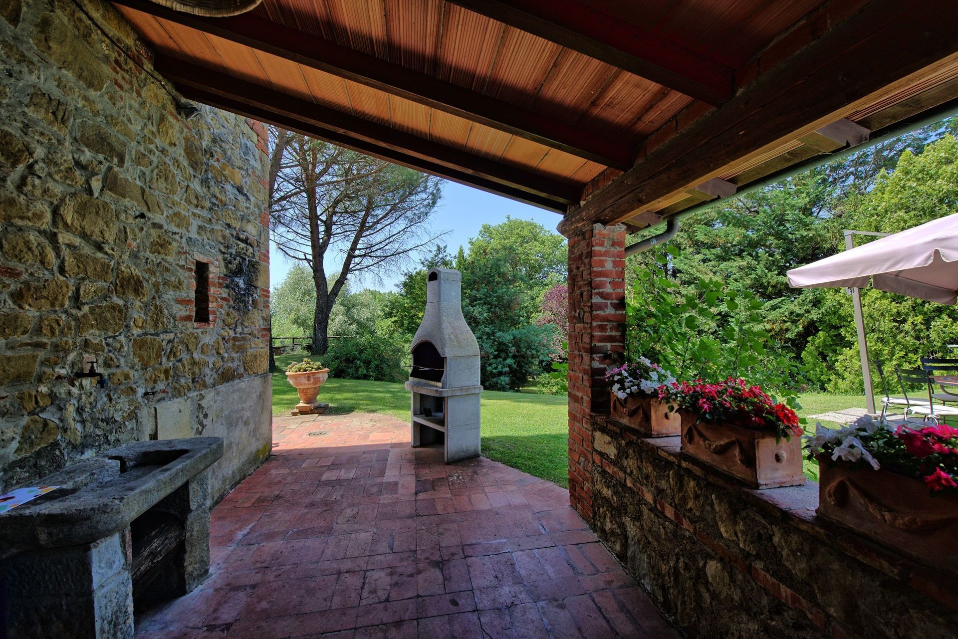 Et dejligt stort udendørs område møbleret med en pergola er tilgængeligt fra køkkenet og er perfekt til udendørs måltider. Grill.