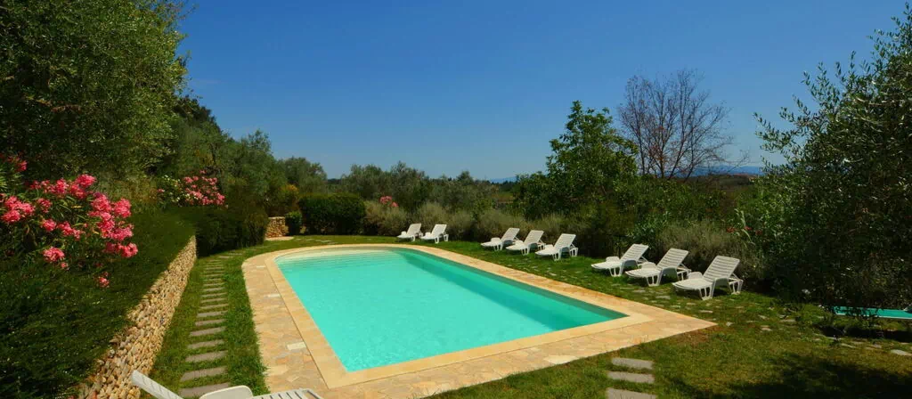 Haverne på 2.000 m² er uden hegn og byder på en åben og naturlig atmosfære med velholdt græsplæne og blomster, der skifter med årstiderne. Svømmepølen på 70 m² er udstyret med elegante romerske trin og indvendig trappe og er tilgængelig fra 3. april til 16. oktober; en udendørs bruser befinder sig i nærheden af poolområdet. Terrassen er rigeligt møbleret med havemøbler og udstyret med barbecue til udendørs spisning og underholdning.
