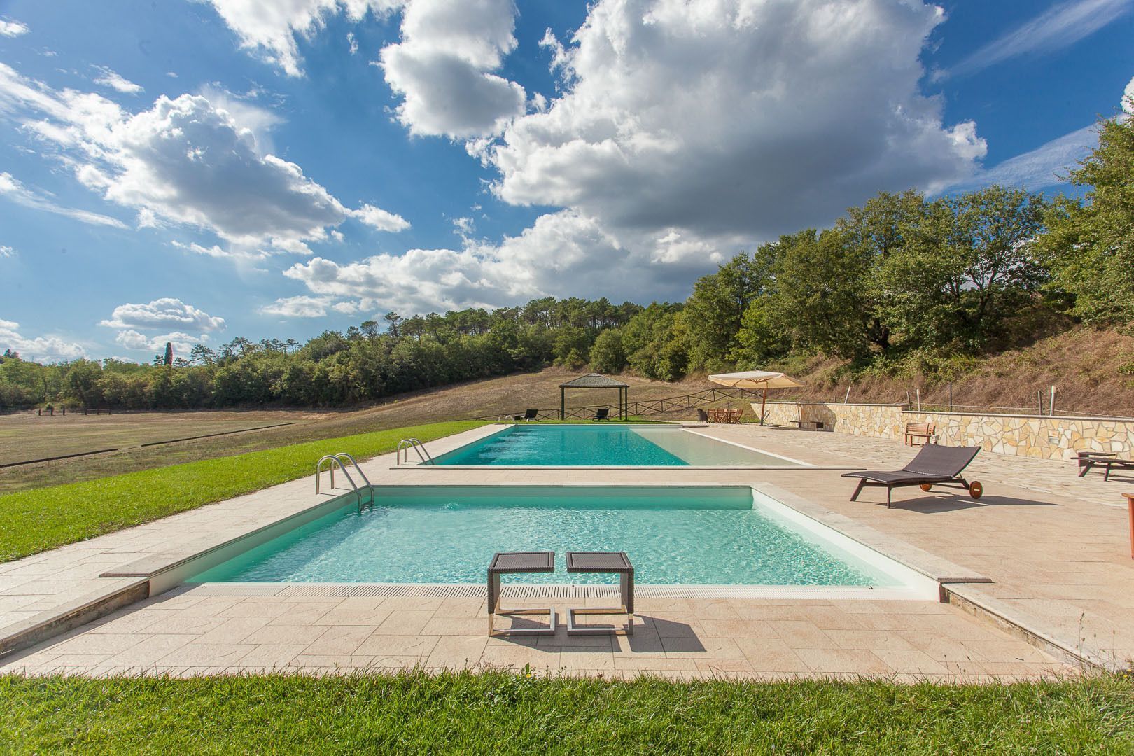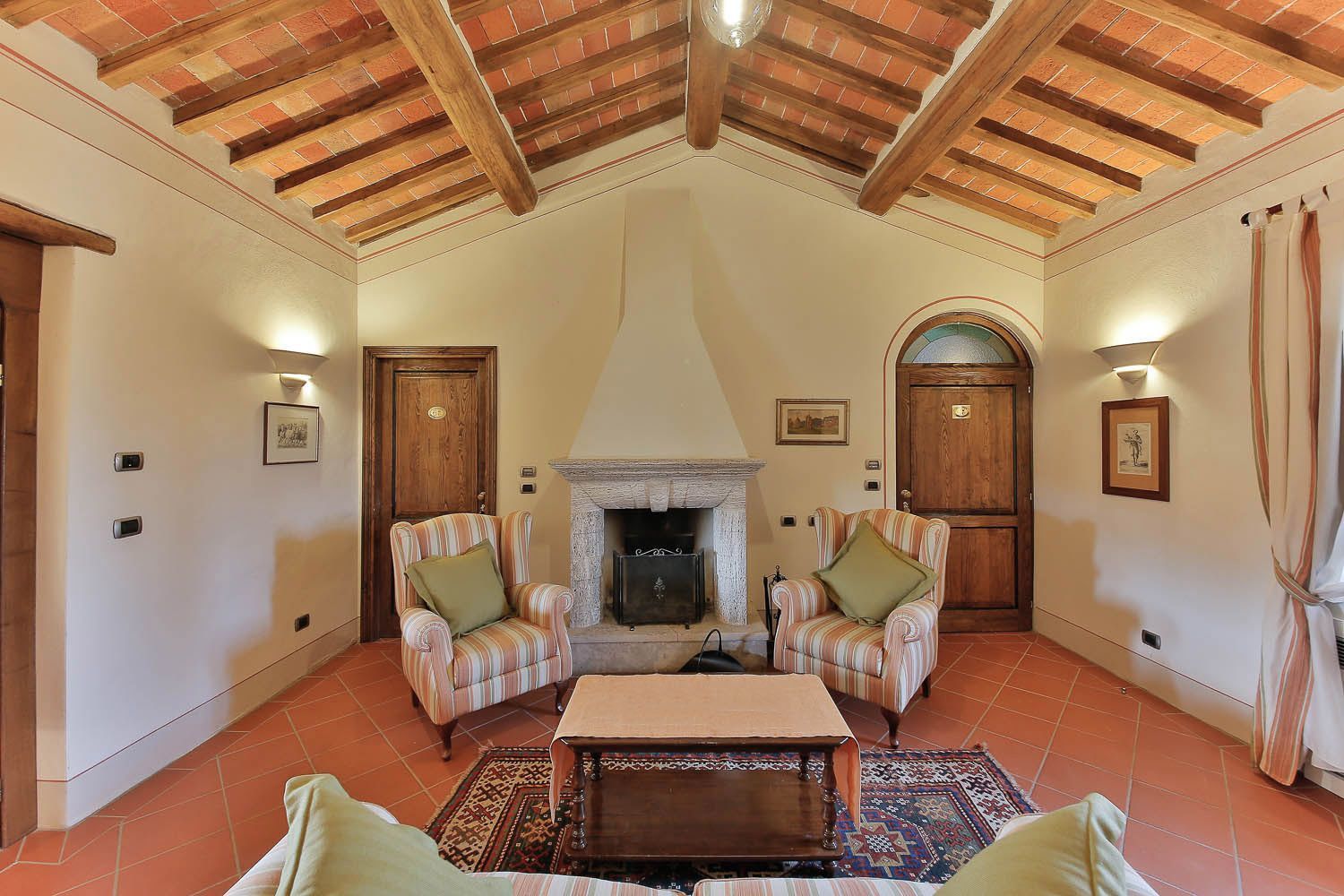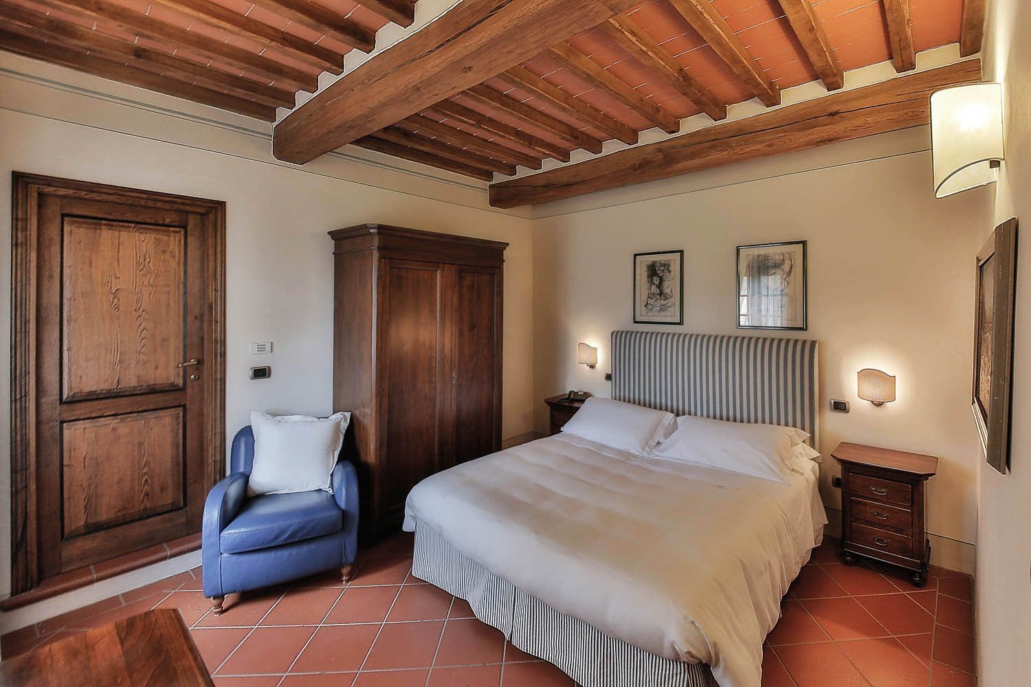 First floor Access from an external staircase. Standard size, air conditioned, double room with en suite bathroom. Tastefully furnished in traditional Tuscan style the room enjoys views across open countryside. Features include double bed with luxury bedding, terracotta flooring, mini bar, satellite TV, telephone and safe. The en-suite bathroom is tastefully decorated in travertine and has a shower, WC, bidet, hairdryer and a complete set of complimentary toiletries.
