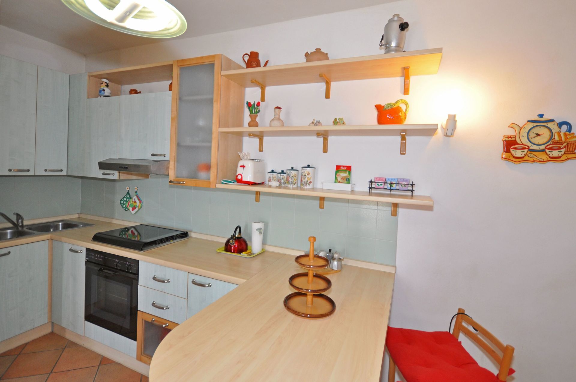 Stueetage (tilgængelig via en vindeltrappe eller udefra): stue med dobbelt sovesofa og køkkenhjørne (ovn), soveværelse med dobbeltseng (aircondition), badeværelse med bruser, bryggers med vaskemaskine.