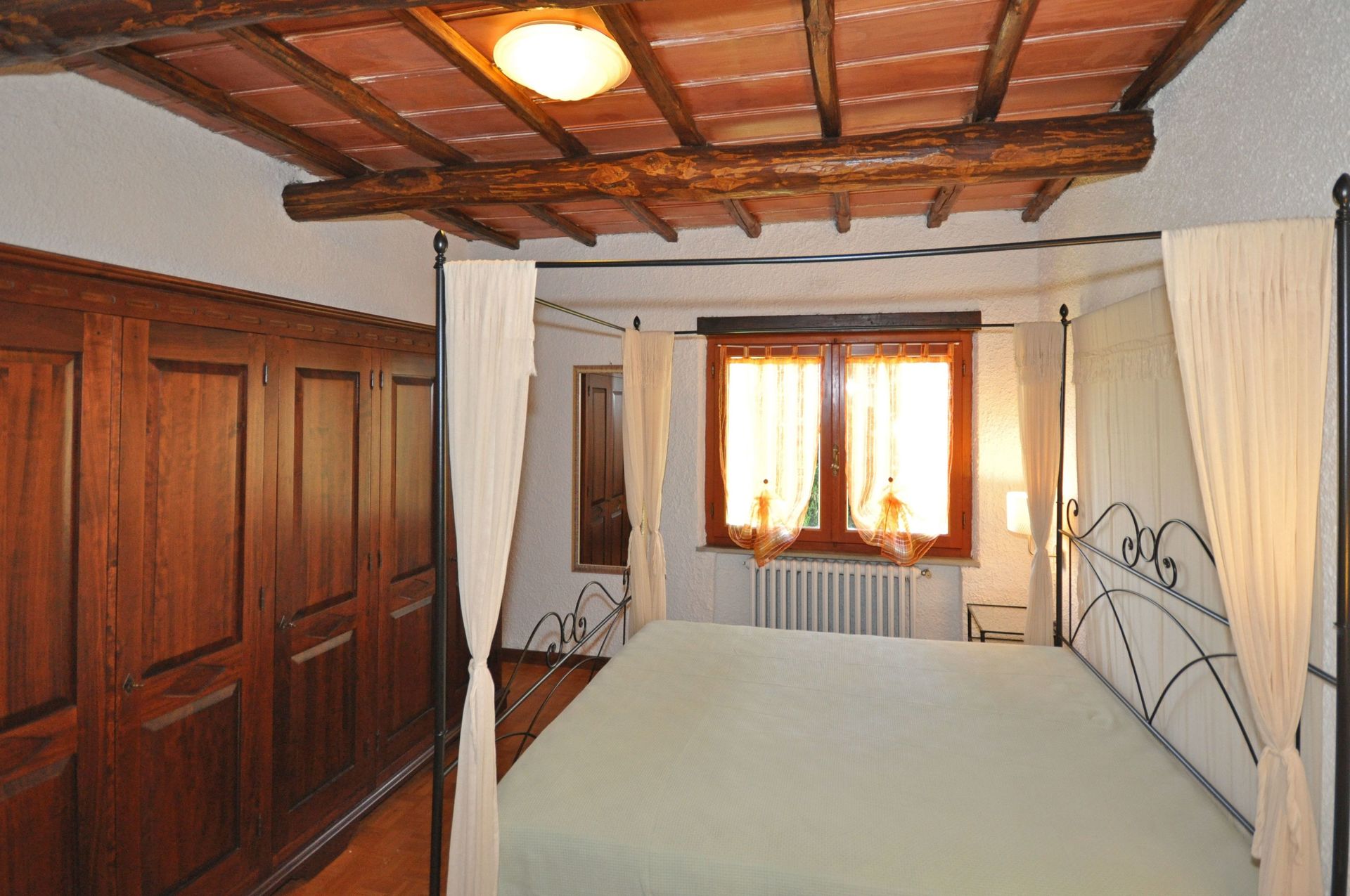 Høj stueetage: opholdsstue med pejs og spiseplads, køkkenhjørne (vaskemaskine, ovn, fryser, mikroovn, amerikansk kaffemaskine), værelse med dobbeltseng med himmelseng (aircondition), badeværelse med brusebad, soveværelse med dobbeltseng (aircondition) med privat badeværelse med bruser.