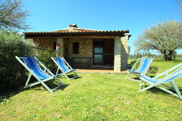Stue med spiseplads og tekøkken (lille el-ovn, fryser, vaskemaskine), dobbeltværelse med udgang til det fri, badeværelse med bruser, dobbeltværelse med ekstra enkeltseng og udgang til det fri