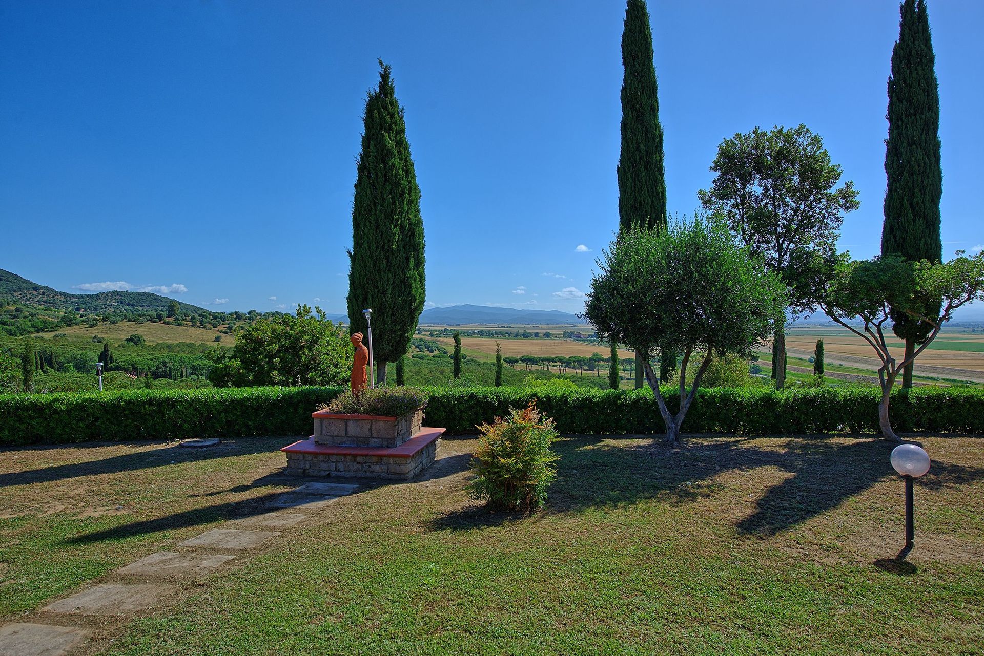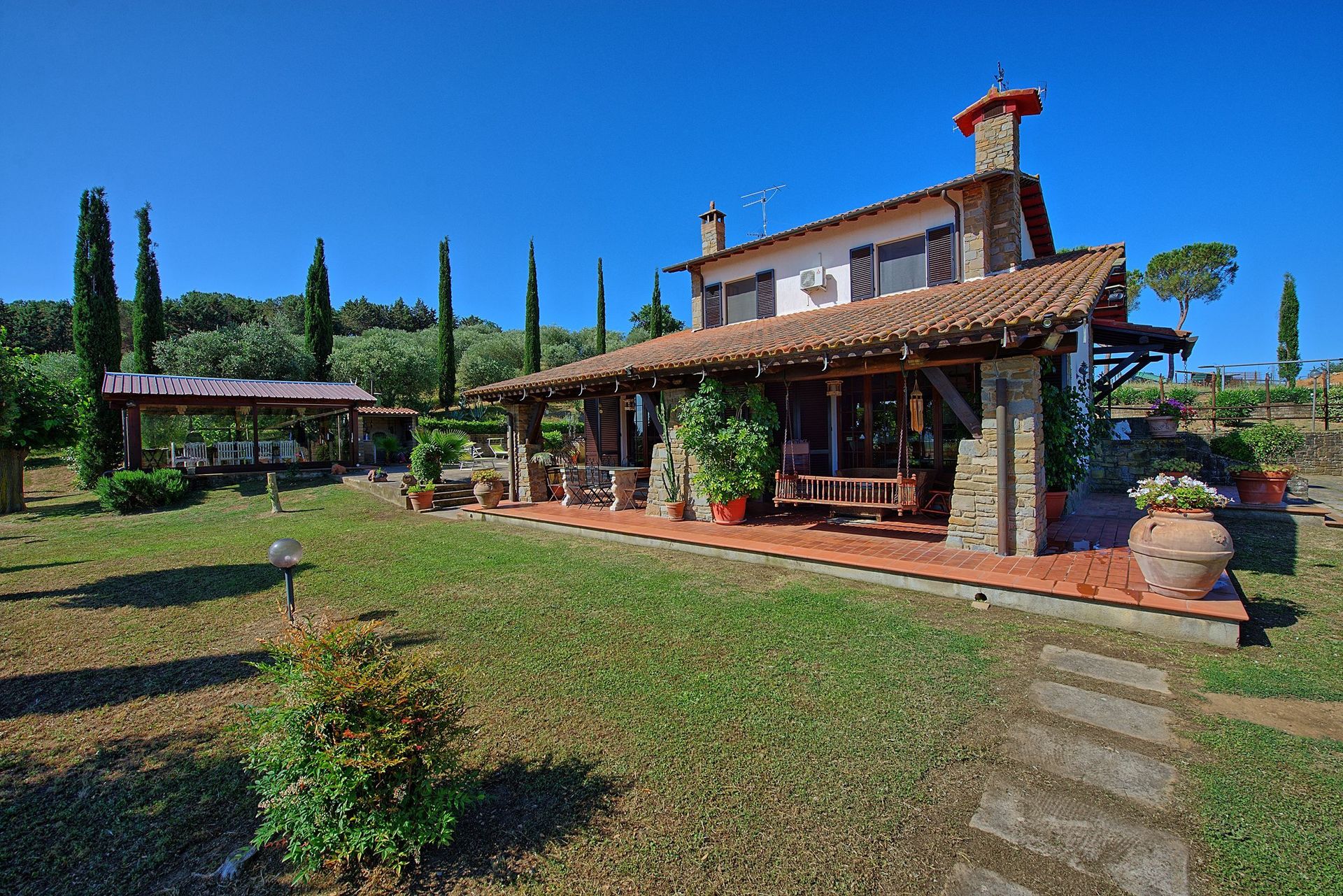Feriehus med smuk panoramaudsigt over landskabet i Maremma-regionen ved Toscanas kyst. Villaen har en stor have med planter og træer som fyr, cypress, rosmarin og andre traditionelle middelhavsplanter.