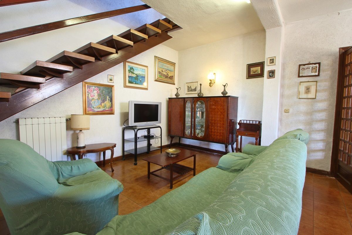 Living room with sofa and armchairs, TV, dining table and stairs to the first floor.