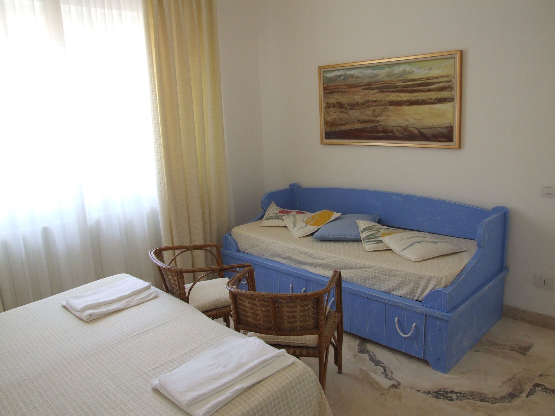 Table and chairs and sitting area with two armchairs and a single sofà bed + 1 extra single sofà bed ( on request and to be paid on the spot).